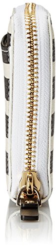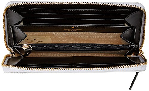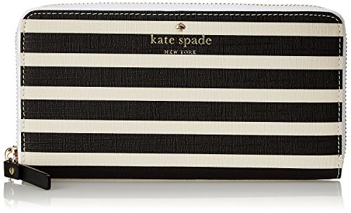 A classic Kate Spade New York wallet in striped vinyl. Logo lettering and exterior pocket. The wraparound zip opens to the lined interior with a dividing zip pocket, 2 bill slots, and 12 card slots.