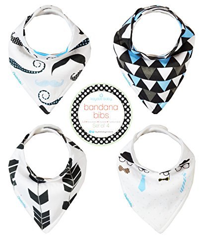 FREE GIFT BAG INCLUDED - Kaydee Baby Bibs are Super Fun and Hip! Your Baby will Dress in Style with our Unique Designs. Our Set of 4 Includes Hipsters, Mustache, Aztec Arrows and Grey , Blue triangles These are the perfect accessory to any baby boy or girl outfit with the added bonus of protecting their clothes. Great baby feeding gift set!;EASY SNAPS ENSURE BIB STAYS ON - Kaydee Baby Bibs come with 2 Nickle-Free Adjustable Snaps For Growing Babies between 3 and 24 Months. They Stay on Even While Baby is Playing Freely. These are a great alternative to velcro straps which are easy to pull off and ruin clothes in the wash. Washing machine safe. Keeps shape after wash!;BACKED BY THE KAYDEE BABY PRODUCTS GUARANTEE - We guarantee you will love the our bandana drool bibs, and if you aren't absolutely satisfied, return it within 30 days for a full refund, no questions asked.;UNIQUE GIFT - Kaydee Baby Bibs make for a Unique and Fun Gift! A Must Have for Baby Showers, Birthdays, Christmas and Any Occasion! Perfect Gift Basket Set! Mothers everywhere are raving about Kaydee Baby Bandana bibs. Fun, affordable, adorable and serve their purpose well.;BEST BABY BANDANA DROOL BIBS - New and Improved Design! 2x the thickness as compared to other brands for extra absorbency and our new stitch helps prevent fraying. Made with 100% Soft Cotton with an Ultra Absorbent Back Polyester Fleece Back Keeps Dribble and Drool Off of Baby, Infant, Toddler Clothes. Gentle to the touch helps keep babies tender skin dry and rash free. Great alternative and much more comfortable than plastic bibs or waterproof material. Very handy to use as a burp rag or burpy bib and easy to store in diaper bags or stroller compartments. Perfect for boys or for girls.
