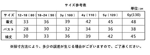 - サイズ: 12-18(80cm) 18-24(90cm) 3Y(100cm) 4Y(110cm) 5Y(120cm) 6Y(130cm)