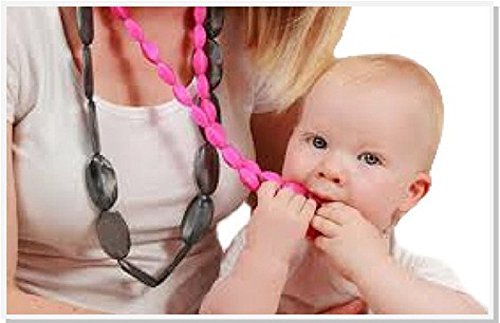 Don't just rely on baby teething tablets, blankets or books. We have baby teething beads! When your baby is teething, he puts everything in his mouth trying to get relief! a teething baby is not a happy baby! All day long you find yourself taking away the remote control, the dog's toys and anything else your baby can get his little hands on. The moment you pick him up, what does he reach for? Your necklace, of course! And you can't have him chewing on that either...or can you? If you're wearing our Baby Teething Necklace, your little one can nibble, suck and bite on your necklace to her hearr's content and get teething pain relief the safe way! It is better than Baby Teething Rings. This baby teething product and jewelry can be better than the baby teething keys and consists of attractive faceted beads made out of 100% nontoxic BPA free FDA-approved silicone. Safer for the teeth than stones or wood, is specially designed to alleviate pain due to teething. As your baby chews on the safe, hypoallergenic beads, the silicone necklace massages his gums to provide teething pain relief. You can even put the teether necklace in the refrigerator to treat your little one to cold therapy! With its securely fastening safety clasp, Teether Necklace will stay right in place on your neck, so it's always ready to come to the rescue when your baby's mouth is sore. Whether you're at home or on the go, you can count on the silicone necklace to provide the teething pain relief needed to keep your baby from becoming fussy and irritable. We're so sure you'll love the teething necklace that we even back it up with a 60-day satisfaction guarantee! Help your baby feel at her best with the safest, simplest teething pain relief solution on the market! Order today in all of your favorite colors. Once you see how effective this teether necklace is, youre going to want one to go with every outfit!