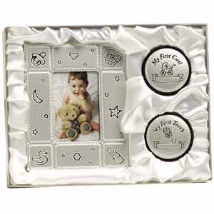1 Photo Frame 2x3;1 Circular Velveteen First Curl Box;1 Circular Velveteen First Tooth Box;Gift Set with Silk Inset