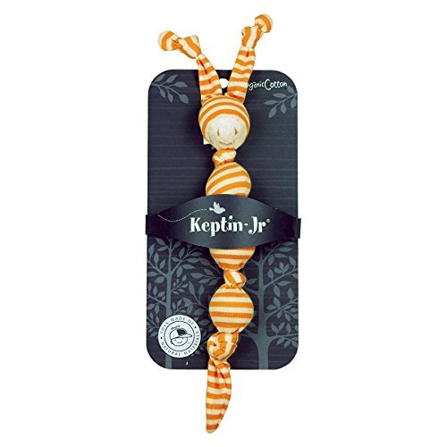 This fun little guy from Keptin-Jr is a fun toy for babies and toddlers 6-18 months old. The striped material is an organic interlock fabric (similar to jersey knit), and the face has more of a plush look and feel. The knots and balls are wonderful for grasping, and the knots on the hat and end, make great teethers. The doll makes a slight rattle noise, just right for a little one. Keptin-Jr has a reputation for high quality design and quality production.