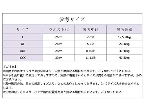 子供用パンツが登場します。 吸水性や保湿性が優れているので、デリケートなお子様の肌にも優しいです。 男の子が喜ぶ動物柄と車柄のお得な3枚セット!便利なカラー違うの3枚なので、その日の気分によって選べるのがうれしいポイント。 サイズも豊富にご用意しておりますので、お兄弟や友達同士でお揃いにコーディネートしてもおすすめです。 ほかのデザインの子供服を販売しておりますので、検索窓から 「Keyaka」 で検索くださいね♪ 【サイズ】 L: ウエスト24*2cm 参考年齢2-5歳 参考体重12.5-20kg XL: ウエスト26*2cm 参考年齢5-7歳 参考体重20-30kg XXL: ウエスト28*2cm 参考年齢8-10歳 参考体重30-40kg XXXL: ウエスト30*2cm 参考年齢11-13歳 参考体重40-50kg 【ご注意】 ※画面上の色はブラウザや設定により、実物とは異なる場合があります。ご了承の上ご注文下さい。 ※平らな面に置いて測定しておりますので、実際に着用されるとサイズが異なる場合がございますが、予めご了承下さい。 ※海外製品の為、日本の規定サイズより小さめのお作りになっております。1~2サイズ大きめをおすすめします。 ※生地の取り方により、パンツ柄の位置等写真と異なる場合がございます。ご了承ください。