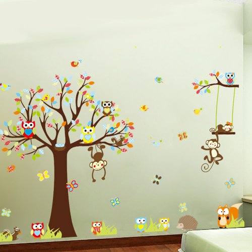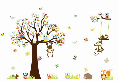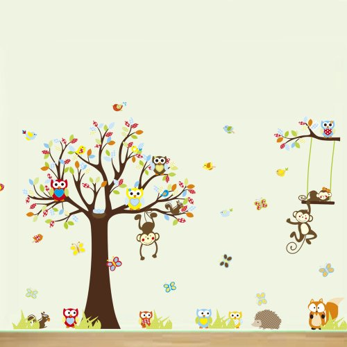 Colorful Owl and Monkey with Tree and Swing Vinyl Wall Decal for Kids, Nursery Room by KiKi Monkey