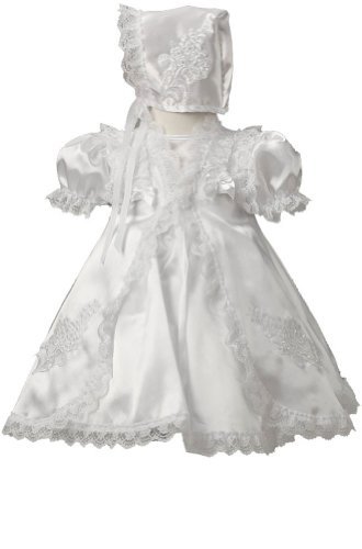 ドレス全体がは、高品質のホワイトサテン。キャップスリーブは、トリムで飾られたボディスは、エレガントな複雑なレース地とビーズとレースの作業です。飾られ、ウエストサッシは、リボンとパール。ペチコートクリノラインネットがアタッチされています。後ろの背面にはボタンのボディスとサッシ結んで、ぴったりフィットします。追加のガウンはお客様の同じ光沢サテン生地と飾り、豊富な靴ひも。また装飾、ビーズとレースの両方のシステムで動作させる、側面のドレスを魅力的にしています。マッチしたボンネットが飾られ、再び一致するビーズとレースのしくみ」を参照してください。とってもゴージャス