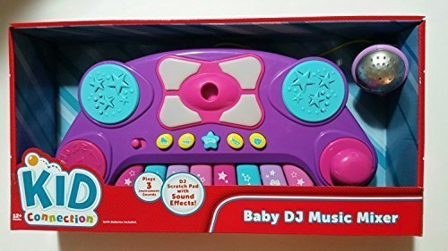 Kid Connection Baby DJ Mixer with Microphone.. Plays three instrument sounds; Trumpet, Xylophone, and Keyboard. For ages 12 months and older.