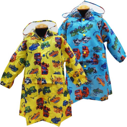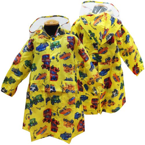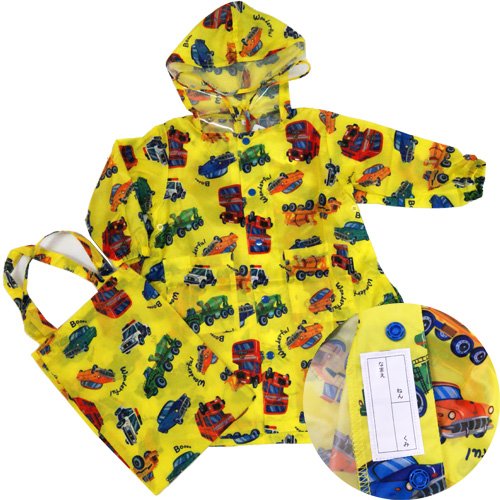 KidsForet(キッズフォーレ) 働く車レインコート&収納バッグ(ブルー・イエロー) とってもかっこいい働く車の総柄レインコート☆ フード周りは透明ビニールで回りも良く見えます☆ 両脇ポケット有り 収納バッグ付き ☆袖口は雨が入らないようゴムが入っています。Sサイズ:85-95cm Mサイズ:105-115cm Lサイズ:115-125cm ポリエステル100%(撥水加工) 仕入国:日本 生産国:中国