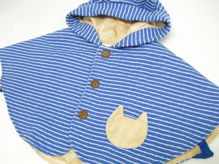 kid's zoo ニットキルトマント B★ とっても柔らかなニットキルトのマントです。 ボーダー柄に内側はふわふわボア! フードのお耳とポッケがキュートですね♪ 使い方は、工夫次第でいろんなシーンに大活躍! ご出産のギフトなどにもおススメですよ♪ カラー:ブルー サイズ:S(70~80センチ) 品質:ボーダー部分 綿 80% ポリエステル 20% 裏地・ポケット部分 ポリエステル 100% 中国製