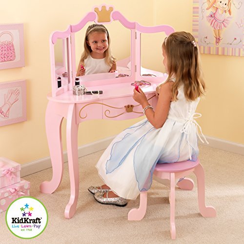 Every princess needs a special place to collect her thoughts, her dreams, and her keepsakes. KidKraft's Princess Vanity Table and Stool provides the perfect place for these important matters. Finished in cheerful pink with gold leaf detail for the royal touch, our vanity will make any little princess feel pampered. Features include: A soft pink-cushioned stool - An unbreakable Plexiglas mirror - A pull-out center drawer with gold crown knob for keeping special treasures.