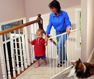 Hardware mounted metal gate;For use at the top of the stairs only;Constructed of strong tubular steel;Easy to open with just one hand;Swings open in either direction