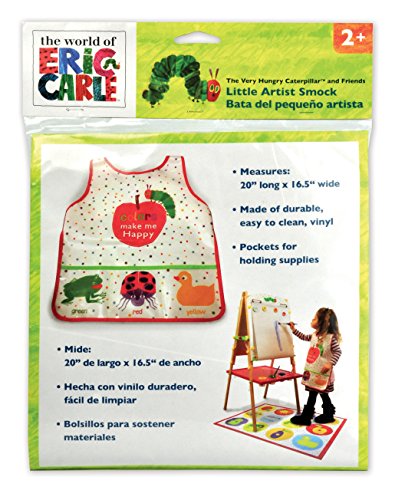 Features characters based on Eric Carle's vibrant art work;Includes vinyl bag with hanger;Smock includes pockets to hold supplies while little ones create;Perfect for boys and girls;20 long and 16.5 wide