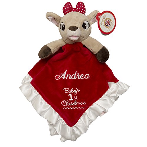 パーソナライズのモノグラムルドルフClarice Baby 's 1st Christmas BLANKYセキュリティブランケット、フォントとねじの色調整され、を特別カスタム刺繍のカスタマイズ選択して、この素晴らしいクラシック休日BLANKYはサテントリム、下のストライプ生地、側面,サイズ: 12 " Hanging , 14 " x14 "展開し洗濯機で洗え、2営業日以内に発送!