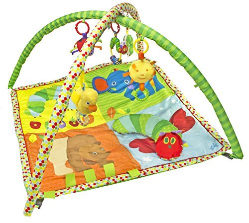 Tummy-Time mat comes with 5 attachable toys that crinkle, squeak, sing, rattle, and more!;Ribbon tags and textured fabrics.;The Very Hungry Caterpillar Tummy-Time pillow and Numbers Bath Book are also included.;Quick and easy buckle assembly!;Flappy elephant ears with crinkle sound.