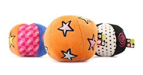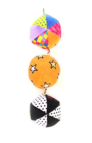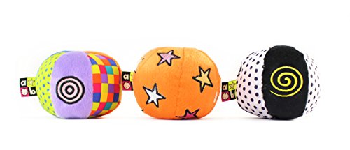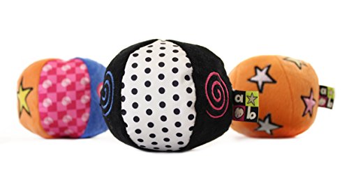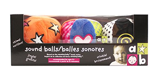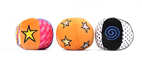 Sounds for baby to touch, listen to, play with, and delight in;Each uniquely patterned ball makes different chime, jingle, or crinkle sound;Made of soft, multi textured plush and fabric;Set of 3 balls with handy carrying tube;Infant safe