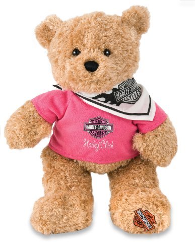 Officially Licensed Harley-Davidson Biker Club Jrs Collection; 10 inch tan plush teddy bear; Dressed in pink "Harley Chick" t-shirt and a white neck bandana Harley-Davidson logo on them; Makes a great collectible; Ideal gift for children;