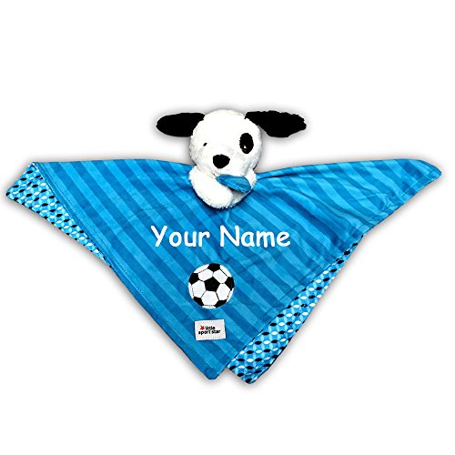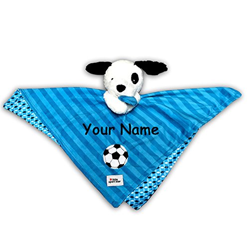 Kids Preferred Personalized LittleスポーツスターブルーとホワイトPuppy Dog WithサッカーボールSnuggler Baby Blanket with名前刺繍 – 18インチ