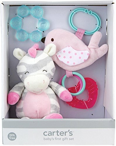 This is adorable Baby's First Gift Set is based on accepted research of how babies develp within the first two years of life, AND most importantly they are fun! The set includes a plush zebra, crinkle bird with clip, and water teethers. Carter's is the leading brand of children's clothing, gifts and accessories in America, selling more than 10 products for every child born in the U.S. Our designs are based on a heritage of quality and innovation that has earned us the trust of generations of families. We believe that childhood is a celebration, and the colorful prints and cute characters we design are inspired by the joy and love children bring into our lives. We celebrate childhood by supporting babies, children, and families with thoughtful designs, quality materials and construction. You can count on carter's to take care of the little details so that you are free to focus on what really matters: celebrating your little one - and the hugs, cuddles, giggles, and babbles that light up our lives.