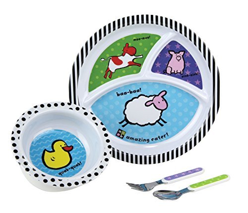 Making breakfast, lunch and dinner meals even more colorful and fun, the amazing baby Farm set includes a divided plate, bowl with suction cup to minimize movement, cup, fork and spoon featuring delightfully illustrated farm animals in bright, bold colors.