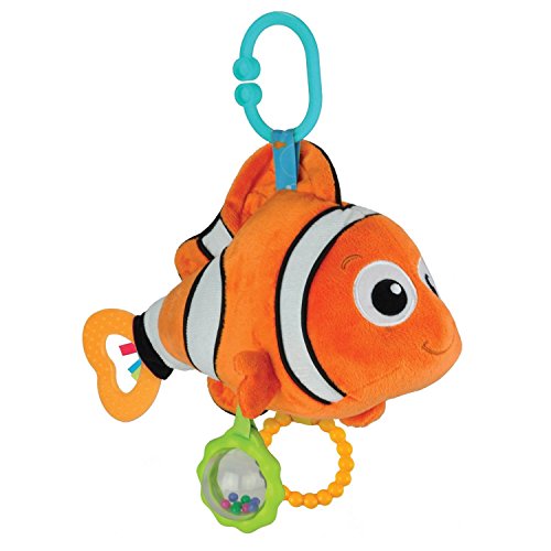 Join Nemo, from the Disney movie Finding Nemo, in his adventure to get home to the ocean and his family with this great nemo developmental toy. Hang Nemo plush from a stroller or crib and watch your baby's eyes light up from all the fun and developmental features. It includes a clear bead rattle and a textured ring and a teether tail for teething babies. It also features a crinkle texture and an exciting chime noise inside.