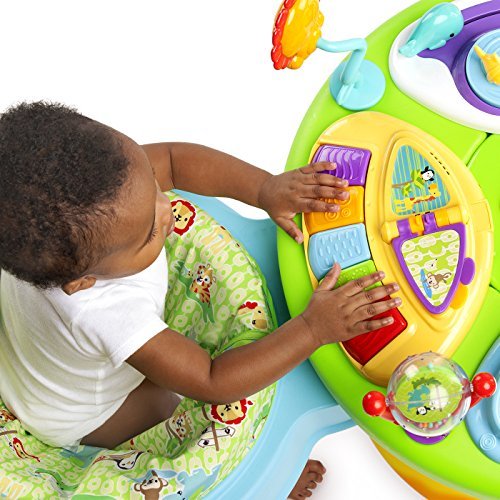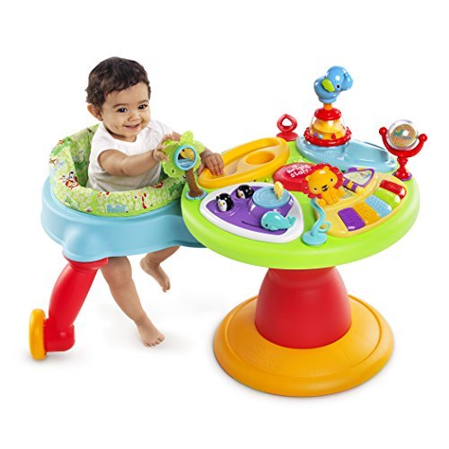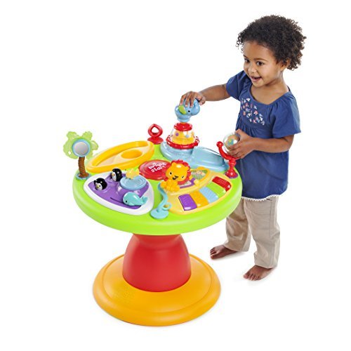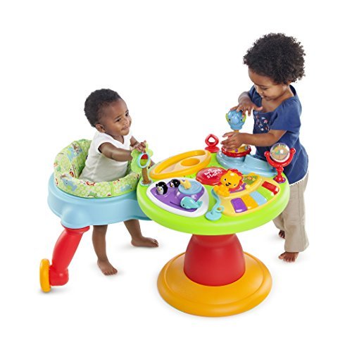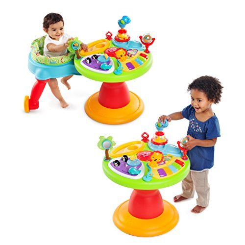 This award-winning activity station has a one-of-a-kind seat that allows baby to safely walk or run around the outside perimeter of the activity table! It's like a walker and entertainer in one! Bright Starts 3-in-1 Around We Go! Activity Center in Zippity Zoo fashion will keep your baby entertained and challenged all the way through the toddler years! 15+ activities include an electronic toy station with volume control and 3 modes of play: melodies, animals sounds and piano notes, plus a flip book with colorful characters and sounds, popping penguins, spinning ball beads, an elephant popper with spinning beads, a teethable palm tree and lots more! Parents have loved this award-winning toy and you'll be glad you chose it for your little one.