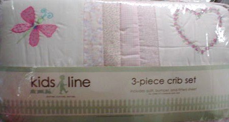 3 Piece Crib Set (QUILT, BUMPER, FITTEDSHEET);Features Embroidered Hearts and Butterflies;Light pink gingham accents and quiltedfloral patchescOLRS ARE WHITE, LIGHT PINK, LIGHT GREEN, LAVENDeR;100% Cotton