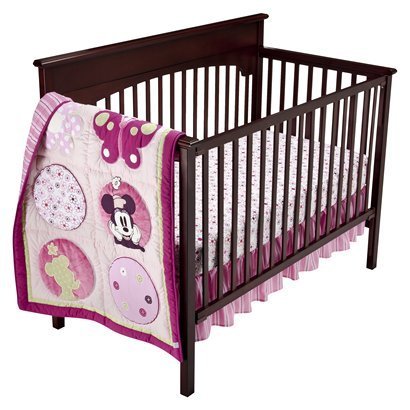 Disney Minnie Mouse 3 Pc Crib Bedding Set Includes: Quilt Size: 33 x 42, Fitted Crib Sheet, Dust Ruffle;Fitted Toddler Sheet is 100% Cotton and fits a standard crib mattress size 28 x 52.;Great for any baby girls nursery;Made from 65% Cotton / 35% Polyester;Machine Washable, Tumble Dry