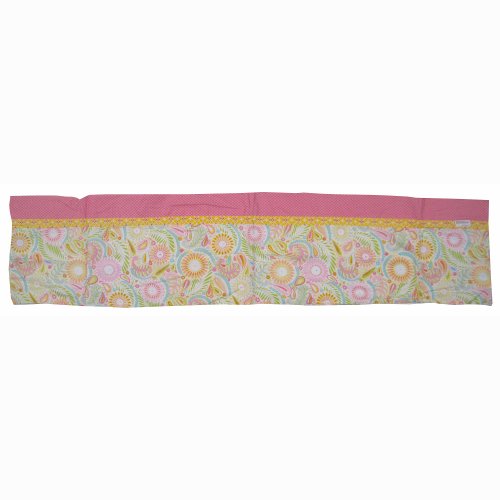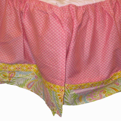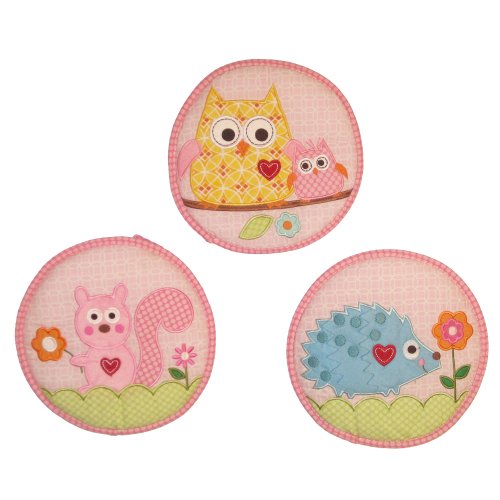Set includes: quilt, dust ruffle, print fitted sheet, solid fitted sheet, window valance, diaper stacker and 3 fabric wall hangings.;The quilt measures 45 inches x 36 inches;The dust ruffle has a 14 inch drop, and the fitted sheets are designed to fit a standard size 28 inch x 52 inch crib mattress;The window valance is 60 inches across with a 14 inch drop including a 3 inch rod opening;The diaper stacker is 25.5 inches x 12 inches x 8.5 inches deep and the wall hangings each measure 9 inches x 9 inches