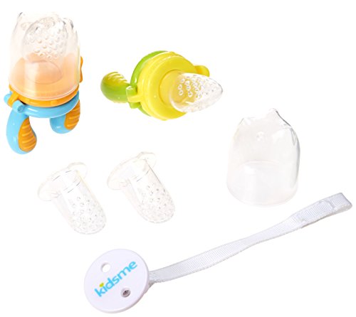 Contains two Kidsme Food Feeders (1 small and 1 large) and extra replacement sacs (1 small and 1 large), and one ribbon clip.;BPA free and FDA tested. Ideal for 4+ months and up. Top-rack dishwasher safe.;Allow your child to eat fresh food without the risk of choking. Unique patent design, improved from traditional mesh bag feeders. Silicone sac makes for easy cleaning, does not retain odors, encourages chewing, more natural and comfortable to the baby. Designed with textured silicone surface works best with frozen fruit or ice cube to soothe teething pain and massage baby's gum.;A clip keeps the Food Feeder safe, clean and within reach. Designed with safety in mind, there are no detachable small parts or sharp pieces.;Different sizes of Silicone Sacs are interchangeable with different food feeder handles. Baby would LOVE to have a second food feeder prepared while enjoying the first one.