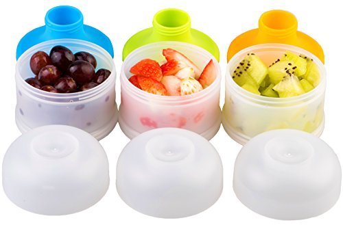 ??3 Stackable Separate Compartments with 3 Twist-Lock Leak-Resistant Lids;??Easy-to-Pour Spout;??Each Container Holds up to 4 oz;??BPA free, Dishwasher Safe. Suitable for: 0-6 years.;??Easy Stacking System, Convenient for at Home or on-the-Go