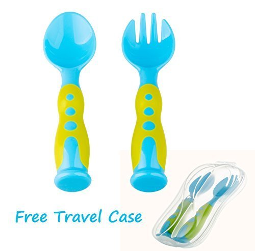 SOFT SAFE MATERIAL--> Our spoon and fork have a rounded design with soft tips and no sharp pointy bits. Our products are made of soft food grade PP material, non-toxic, stability and toughness. Each set is proven to be Lead free, BPA free, and Phthalate free. Suitable for: +6 Months.;SMART ERGONOMIC DESIGN--> Ergonomically designed contoured handle is comfortable to hold. Rounded, soft spoon bowls are gentle on baby's gums. Unique two-tone design, bright colors, light weight. With stand design, makes baby like them a lot. Can be adjusted to child's motor skill development. Helps children transition to regular utensils.;FREE TRAVEL CASE--> A diaper bag might not be the cleanest place in the world. While traveling your baby spoons will touch every bit of gunk and goo in the bag which eventually will end up in your baby's mouth. Our free travel case ensures that no matter what is in your diaper bag, your utensils will stay incredibly clean.;MAKE FEEDING EASY-->Unlike some baby spoons which can be too deep and long, our spoon and fork set is soft, easy to grip, and is designed to make meal time easy whether you are feeding your baby or your baby is learning to self-feed. Our cutlery can be washed in the top rack of the dishwasher, making cleanup simple.;MAKE MEAL TIME FUN--> We challenge parents with even the fussiest eaters to try our safe eating set. Each set comes with fork and spoon in exciting colors, included travel case. Each set is soft, dishwasher safe, and designed to make meal time fun! These make a great present and are the perfect baby shower gift.