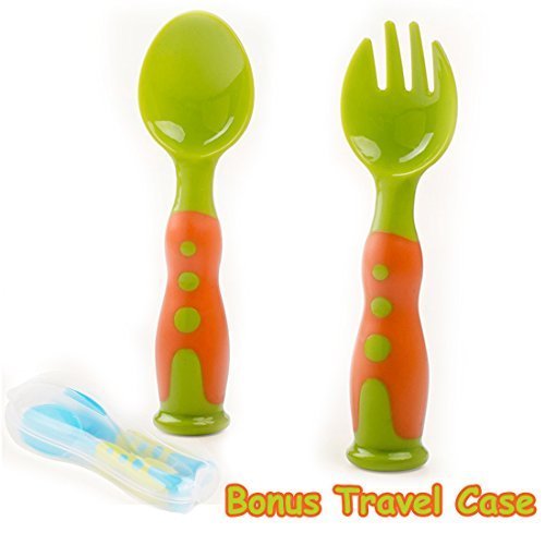 SOFT SAFE MATERIAL--> Our spoon and fork have a rounded design with soft tips and no sharp pointy bits. Our products are made of soft food grade PP material, non-toxic, stability and toughness. Each set is proven to be Lead free, BPA free, and Phthalate free. Suitable for: +6 Months.;SMART ERGONOMIC DESIGN--> Ergonomically designed contoured handle is comfortable to hold. Rounded, soft spoon bowls are gentle on baby's gums. Unique two-tone design, bright colors, light weight. With stand design, makes baby like them a lot. Can be adjusted to child's motor skill development. Helps children transition to regular utensils.;FREE TRAVEL CASE--> A diaper bag might not be the cleanest place in the world. While traveling your baby spoons will touch every bit of gunk and goo in the bag which eventually will end up in your baby's mouth. Our free travel case ensures that no matter what is in your diaper bag, your utensils will stay incredibly clean.;MAKE FEEDING EASY-->Unlike some baby spoons which can be too deep and long, our spoon and fork set is soft, easy to grip, and is designed to make meal time easy whether you are feeding your baby or your baby is learning to self-feed. Our cutlery can be washed in the top rack of the dishwasher, making cleanup simple.;MAKE MEAL TIME FUN--> We challenge parents with even the fussiest eaters to try our safe eating set. Each set comes with fork and spoon in exciting colors, included travel case. Each set is soft, dishwasher safe, and designed to make meal time fun! These make a great present and are the perfect baby shower gift.