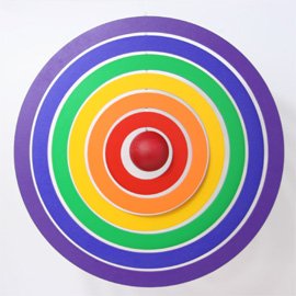 6本の輪が赤から紫まできれいな虹色に彩色されて、同心円状に並んでいます。輪は木製で、厚さ約4.5mm、幅約17mm。中心には赤い木の玉がついています。