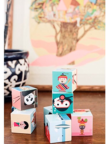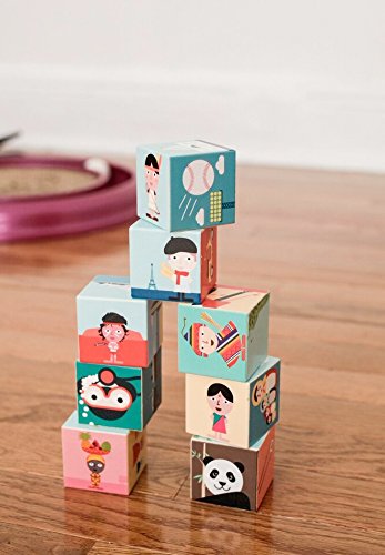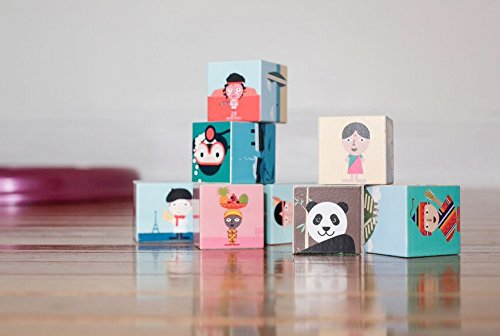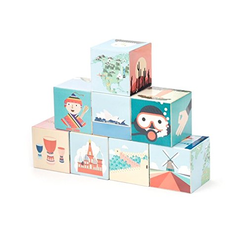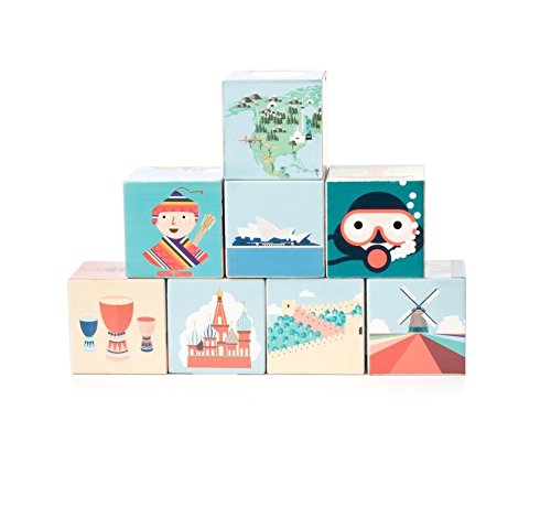 Build cultural knowledge with these illustrated blocks. Each one represents a different country and bears the cultural landmarks, animals, and people of the region. Geo Blocks come as a set of 8.
