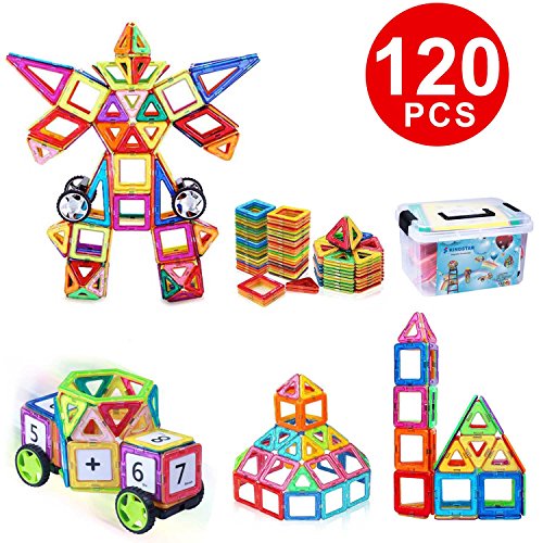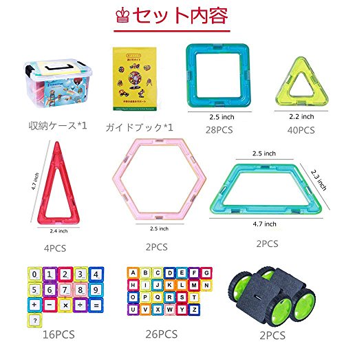 - Block✔ 【収納ケース付き!マグネットブロック 120 PCS】:40pcs*三角形、28pcs*正方形、2pcs*六角形、2pcs*台形、4pcs*長三角形,、26pcs*アルファベットプレート(非磁性)、16pcs*数字カード(非磁性)、2pcs*車輪。磁石ブロックの形が様々あり組み合わせ次第(こいぬ・キノコ・金魚・ロケット・宇宙人など)で何でもできるので、子供の豊かな発想力がさらに磨かれる知育 おもちゃです。