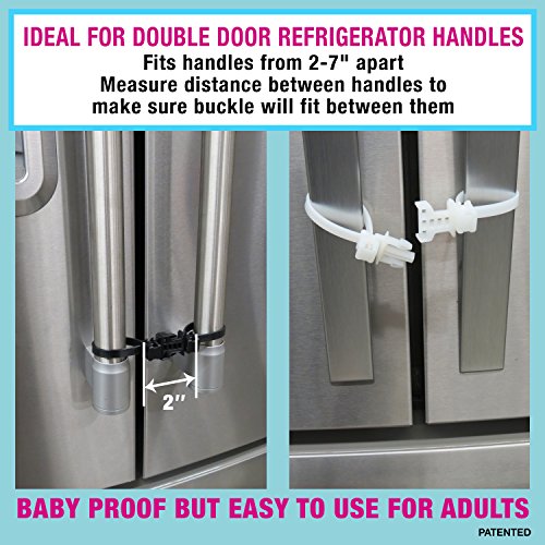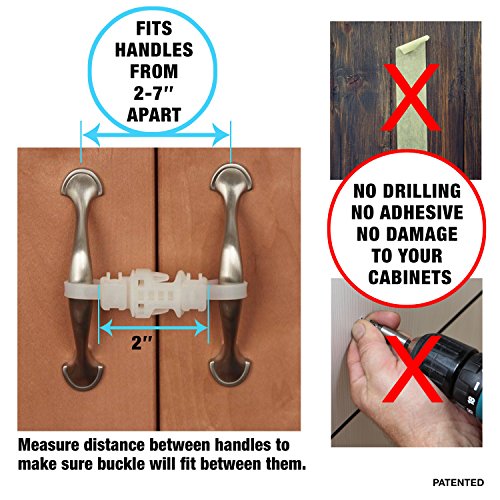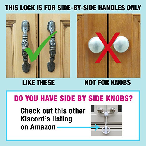 Attach these small child cabinet locks to any cabinets having side-by-side straight (closed loop) handles between 1-5/8 to 7 inches apart. Have knobs? See our other safety cabinet latch designed specifically for side-by-side knobs.;Simple zip-tie strap is military grade and tested to over 120lbs. They take just seconds to install and remain permanently attached to your cabinet door handles so they are always there when you need them. Use them for as long as needed, then just cut off to remove.;No drilling, no adhesive, no lost or misplaced magnets and no damage to cabinets;This baby safety cabinet lock design is easy for adults to open, but difficult for small children.;Kiscords child safety cabinet straps are the smallest lock on the market. They are made from safe nylon, and are proudly made in the USA