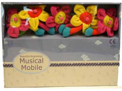 The Beautiful Beginnings sunshine flower mobile gently rotates to the sounds of ?Brahms Lullaby?. It is suitable from birth and upwards and has an adjustable clamp that will fasten onto the cot. An ideal soothing item that once started will gently lull and soothe your baby to sleep. The brightly coloured, friendly flowers help your baby to settle down for their sleep.We can?t promise that the Beautiful Beginnings range of nursery products will make your child a genius, but they will certainly stimulate their senses and help to develop their skills. There?s only one word for this Beautiful Beginnings Nursery Product and that word is ?Quality?.