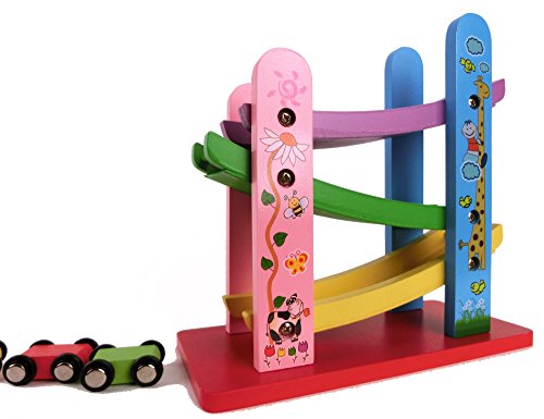 車がスロープを滑り落ちる玩具です。 音と動きが魅力! ! 定番の木製スロープ玩具です。