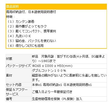 - 特徴: (1)カンタン装着 (2)肩や腰がとってもラク (3)とっても軽くてコンパクト (4)丸洗いOK (5)留め金、バックルを使わない (6)寝かしつけにも活用可能