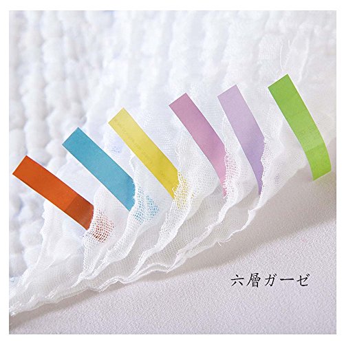 - 六層ガーゼの材質で、赤ちゃんや女性の肌をやさしく包み、お風呂上りの水分や汗をすばやく吸収します。