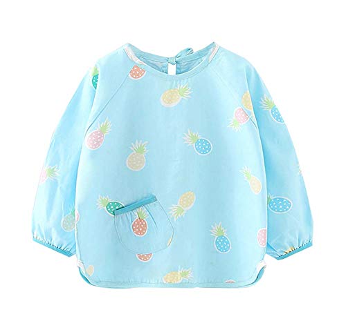 (フルーツ柄)子供防水長袖スモックエプロンよだれかけ1枚 青、0歳から2歳