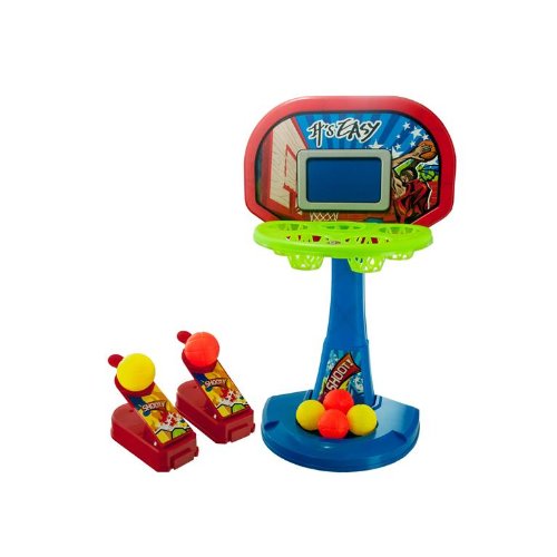 Two press-action shooters. Backboard can be played as a single hoop or switched for the competition style multi-hoops. Not recommended for children under three. Made from plastic. Green, blue and red color. Assembly required. Weight: 2.33 lbs.. Kids will love playing this game.