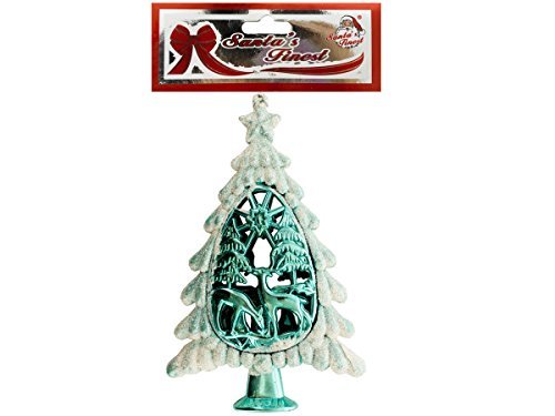 Perfect for decorating the tree, front door or anywhere around the home, this festive Christmas Glitter Tree Ornament features a molded metallic 3D tree with a reindeer scene in the center and glitter coated edges. Includes metallic hanging loops at the tops. Comes in assorted colors. Comes packaged in a poly bag with a header card.