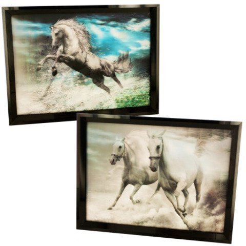 Add motion and grace to your space with this majestic 3D Holographic Horse Framed Wall Art featuring three-dimensional changing images of running horses inside black frames. Comes in two assorted styles: white horse running through water and three white horses/black and red horse running through water with the moon in the background. Measures approximately 16" x 12". Comes shrink wrapped.