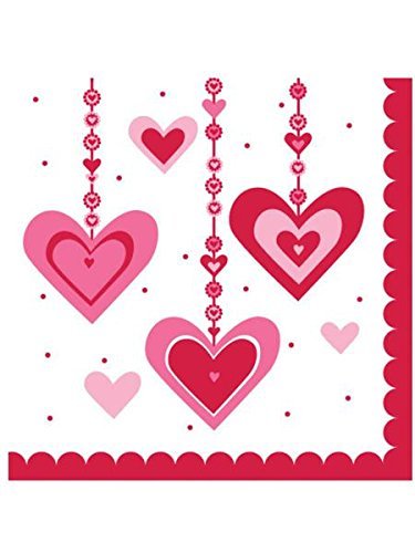 Perfect for Valentine's Day parties, anniversaries or any occasion, this sweet 18-count 2-ply 12-7/8" x 12-3/4" Heart Dazzler Lunch Napkins Set adds romantic charm to the table. Attractive design features hanging hearts against a white and red polka dot background with a scalloped red trim. Comes packaged in a poly bag with a UPC sticker.