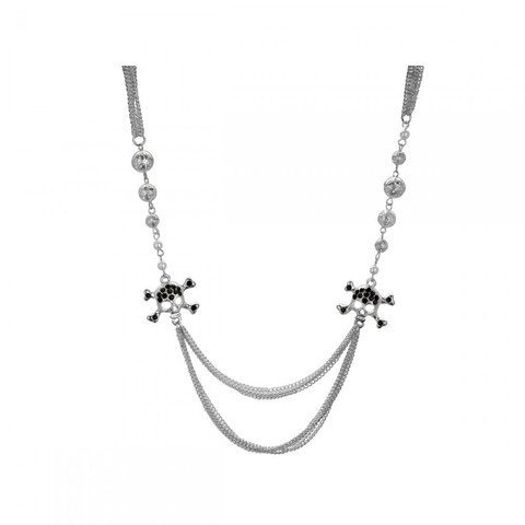 Black crystal inlays glamorize this edgy skull-and-crossbones necklace. This multi silver tone chain is highlighted by filigree beads in graduated sizes with pearl accents. Features a lobster clasp with 3" necklace extender and is packed in a zip locked plastic bag and hang tag.