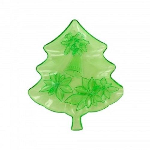 Perfect for candies, snacks and more, this Decorative Christmas Tree Tray features a transparent green plastic tree-shaped tray with details of holly, a bell and poinsettias. Measures approximately 12" x 0.75" x 10.5" x 1". Comes loose with a UPC label.