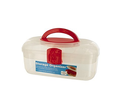 Organize your crafts, sewing supplies, school supplies, tools and much more with this convenient Storage Organizer Box featuring a removable tray with six variously-sized compartments, an easy-carry handle and a snap lock. Measures approximately 11" x 6" x 5.25". Comes loose with a UPC sticker.