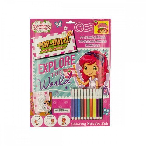 Great for hours of coloring, decorating and playing, this 70-piece Strawberry Shortcake Pop-Out Coloring Kit features a large assortment of fun coloring pieces and markers. Kit includes: 10 pop-out coloring boards, 10 washable markers and 50 stickers. For ages 3 and up. Comes packaged in a hanging panel.