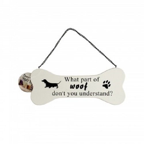 Perfect for dog lovers, grooming salons, veterinary offices and more, this Dog Bone Wall Sign features a white composite wood sign in a bone shape with a decorative print of a black dog, paw print and the fun phrase "What part of woof don't you understand?". Hangs with a black painted metal chain. Measures approximately 11.75" x 4.5". Comes packaged with a hang tag.