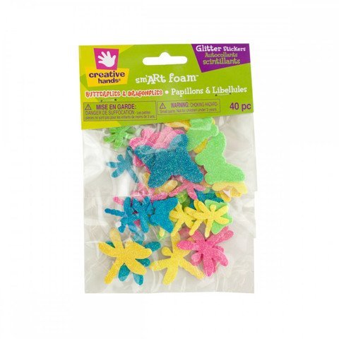 Great for decorating and craft projects, this 40-piece Butterflies & Dragonflies Glitter Foam Stickers Set features glitter-coated cutout foam butterflies and dragonflies in a variety of colors and sizes with adhesive backs. For ages 3 and up. Comes packaged in poly bags with a header card.